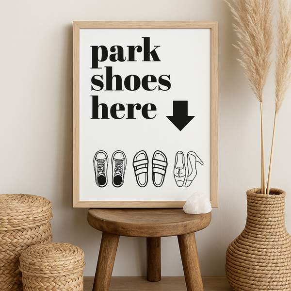Het bord meet 30 x 40 cm, heeft een houten kader en is vormgegeven in een minimalistische zwart-wit stijl met speelse schoenillustraties. Zo past het moeiteloos in elk interieur – van modern tot boho en wabi-sabi – en maakt het je inkomhal zowel praktisch als stijlvol.