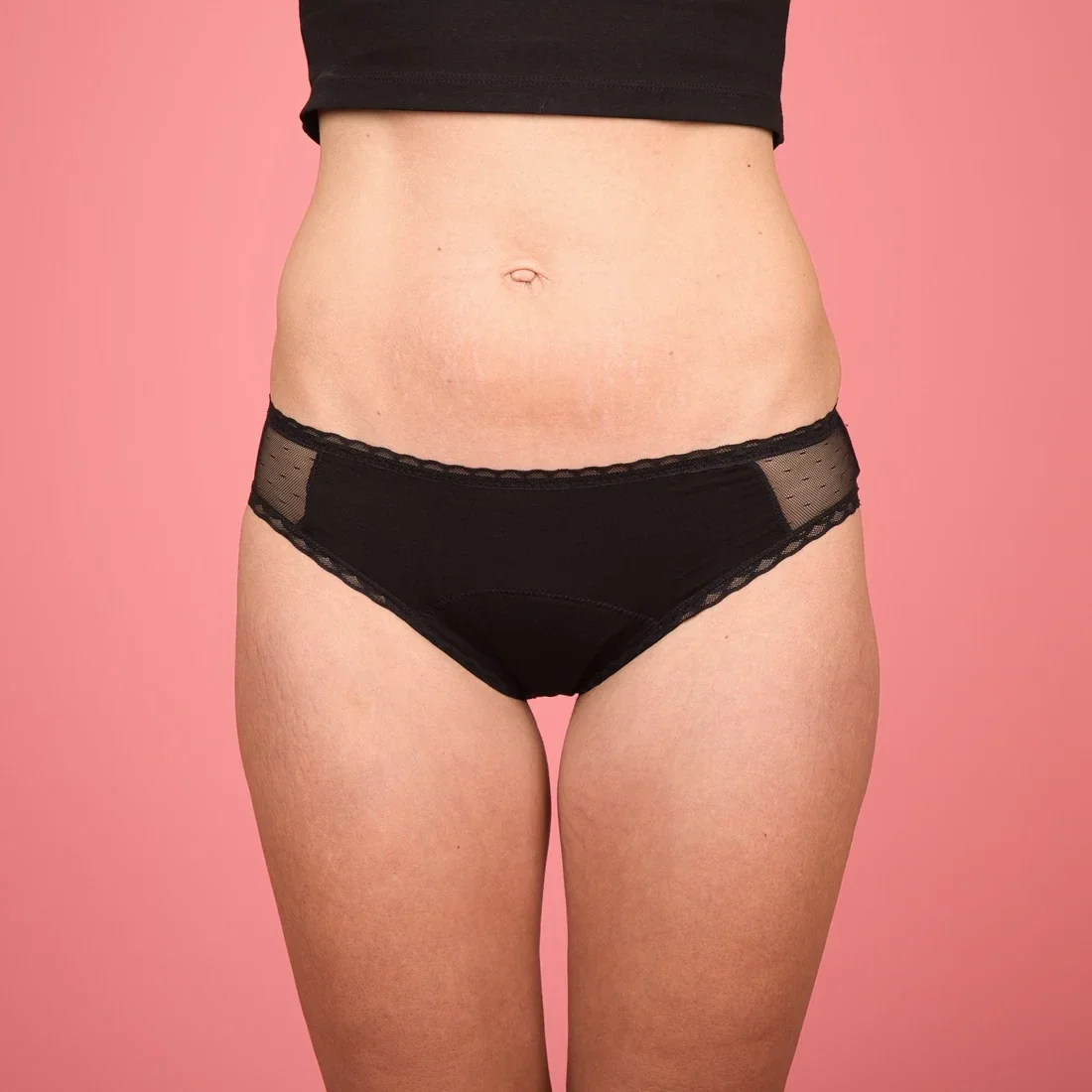 Onze lieflijke COCO is een slip met een heel lage taille. Dit bikinimodel heeft een klein stukje doorschijnende stof opzij en kanten franjes rond de middel en billen. Speels en vrouwelijk. Het heeft een absorptie van 2 tot 3 tampons, dus ideaal voor medium verlies.