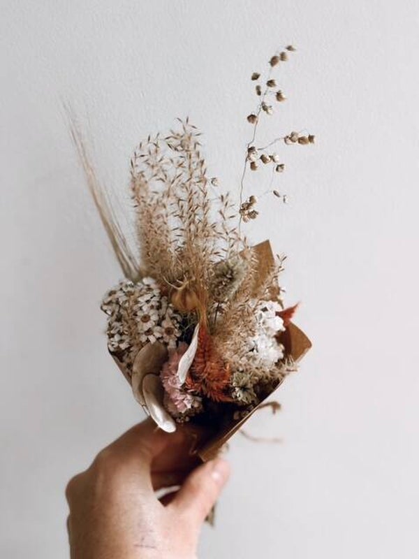 Bij Studio Bloem worden alle bloemen met zorg geselecteerd bij ecologische, lokale telers. In ons atelier worden ze daarna op een natuurlijke manier gedroogd en met veel liefde verwerkt tot gifvrije, blije boeketjes. We geloven in de pure schoonheid van de natuur, zonder in te boeten aan duurzaamheid of kwaliteit.