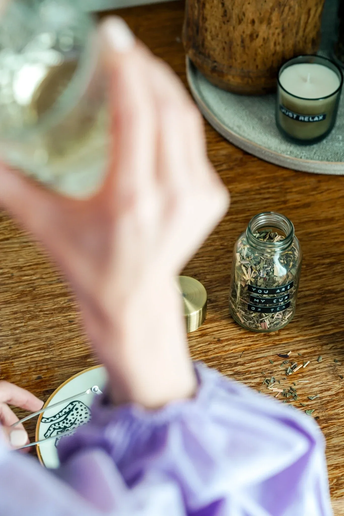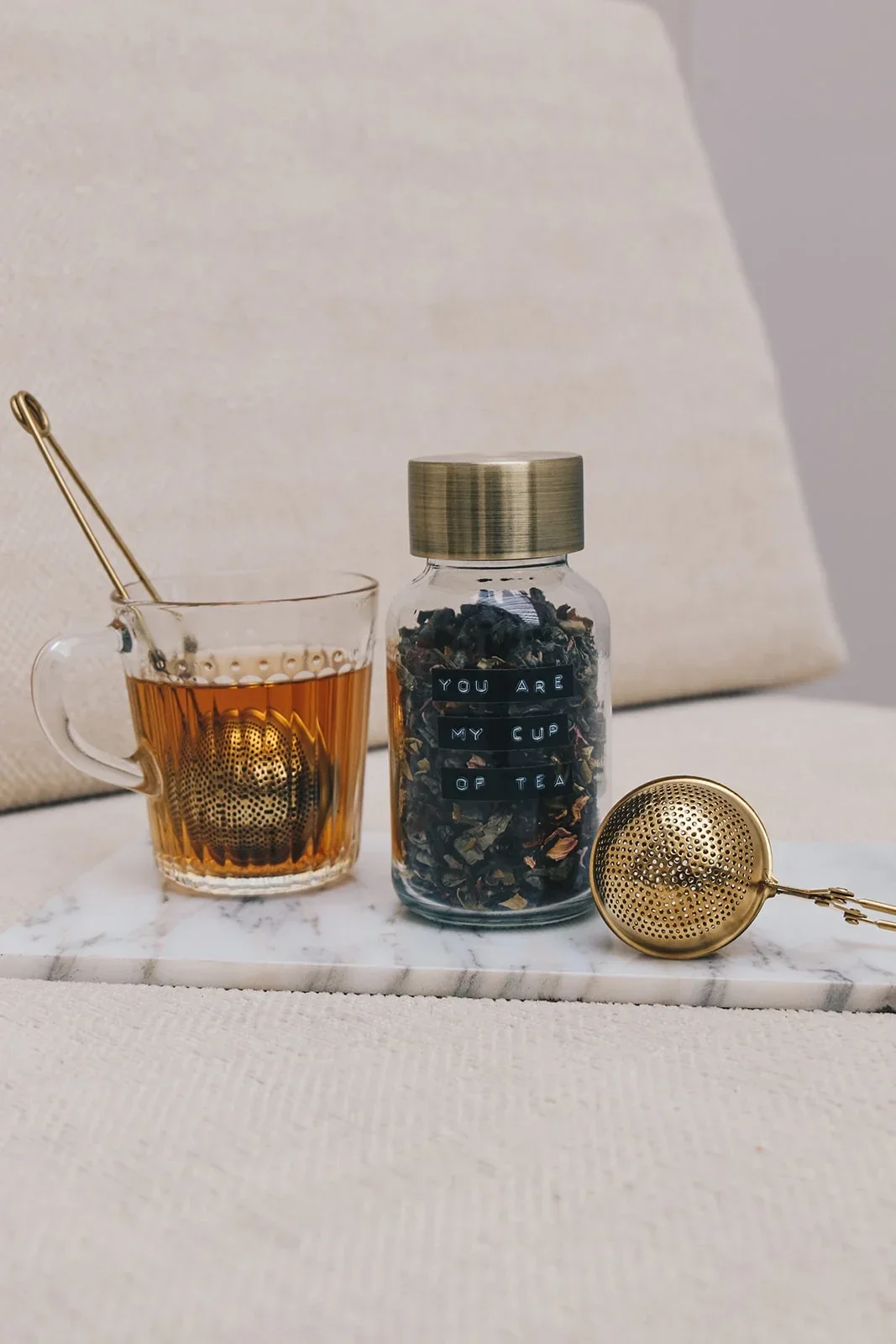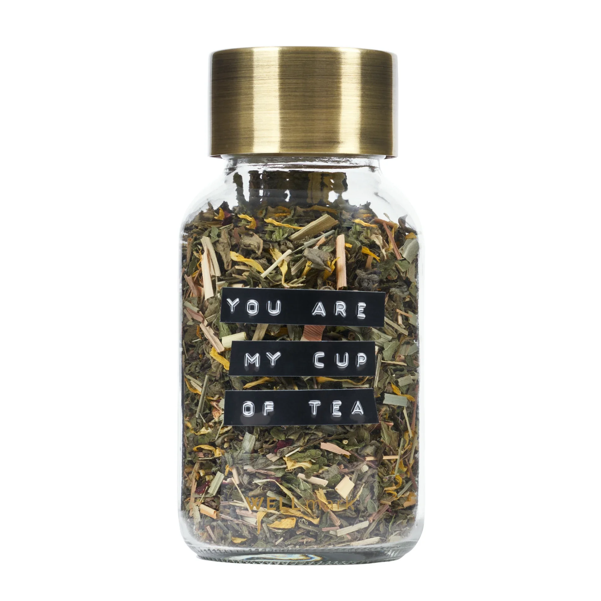 Kom tot rust met een heerlijk kop warme thee. De thee zit in een glazen fles met een brass schroefdop en heeft een inhoud van 250ml.