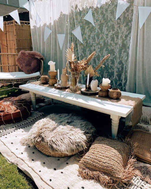 -verschillende boho vloerkleden om rondom de tafels te leggen + onderlaken ter bescherming